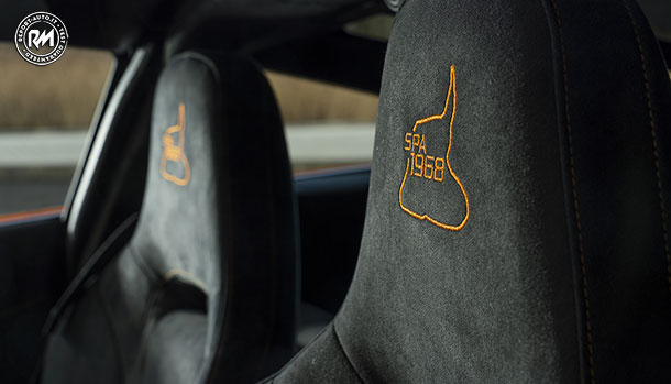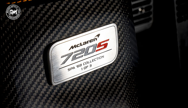 Ognuna della tre McLaren 720S Spa 68 Collection propone il corpo vettura in Orange colorazione MSO Bespoke Anniversary creata per rispecchiare il colore della vettura da corsa del 1968. Il teatro della famosa vittoria – la prima di molte riportate dalla McLaren uno delle squadre più vincenti nella storia della F1 – il profilo del tracciato lungo 14km di Spa-Francochamps – come era nel 1968 è riprodotto sulla vettura – innanzi alla ruota posteriore, in colore argento, e ricamato in colore Orange sul poggiatesta.