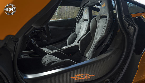 Dettagli opzionali dalla gamma Defined offerti da McLaren Special Operations (MSO ) equipaggiano questa serie limitata e sono: “sill covers” allungati riportano l’iscrizione “1st McLaren F1 victory Belgian Grand Prix 9th June 1968 – Bruce McLaren”. La chiave d’accensione personalizzata MSO Defined richiama la vittoria con il colore Anniversay Orange e con la scritta in argento “Spa 68”. Ognuna delle tre vetture reca la targhetta personalizzata che riporta il numero della vettura.