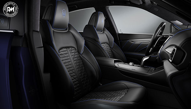 Gli interni sono caratterizzati da sedili sportivi in pelle naturale “Pieno Fiore” di colore nero con impunture a contrasto e logo “Trofeo” ricamato sul poggiatesta.
