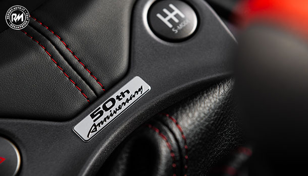 Dal volante rivestito in Alcantara ai sedili in pelle di camoscio, al logo 50esimo anniversario in rilievo sui poggiatesta.