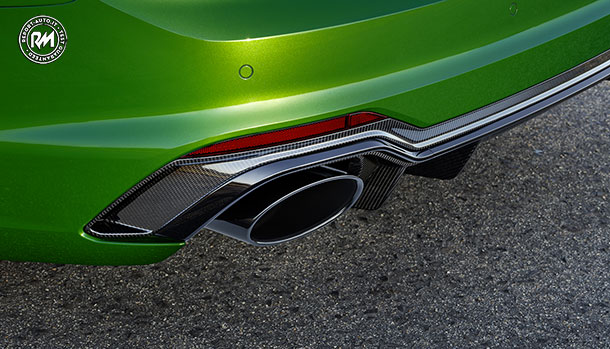 Esteticamente, l’anteriore si caratterizza per la calandra single frame con prese d’aria allargate e struttura a nido d’ape mentre al posteriore un estrattore aria in carbonio separa i due voluminosi terminali di scarico, ovali.