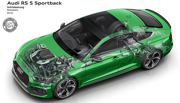 Spinta da un V6 biturbo da 2,9 litri, la nuova Audi RS 5 Sportback vanta la trazione integrale permanente con differenziale autobloccante e cambio tiptronic a 8 rapporti.
