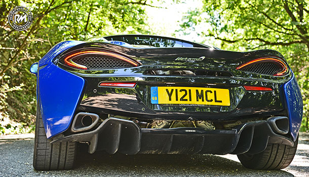 Bassa, acquattata, ha sbalzi da vera hyper car, con un cofano bagagli ( il motore è posteriore centrale), che si caratterizza per sottili nervature che danno anche risalto a gruppi ottici a LED che ritraggono l’emblema del marchio inglese.