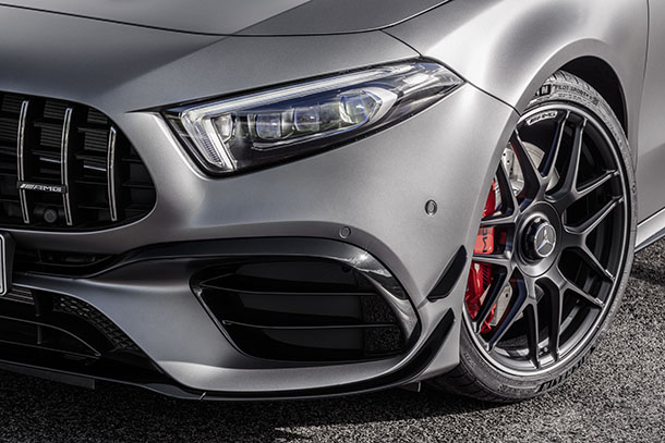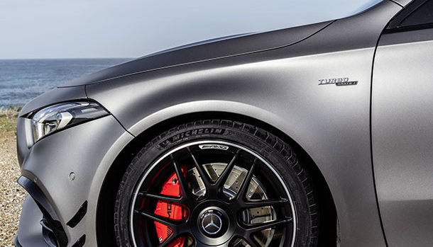 La versione AMG S è equipaggiata con cerchi in lega leggera da 19 pollici a 5 doppie razze – larghi 8,5 pollici per la A 45 S 4MATIC+. Gli eleganti cerchi in lega, ottimizzati dal punto di vista aerodinamico, sono verniciati in grigio tantalio e torniti con finitura a specchio e montano pneumatici 245/35 R 19 o 255/35 R 19. Per i modelli base l’impianto frenante AMG ad alte prestazioni offre pinze dei freni verniciate in grigio con scritta AMG bianca. La versione AMG S si distingue anche per le pinze dei freni a 6 pistoncini di maggiori dimensioni e verniciate in rosso con scritta AMG nera.