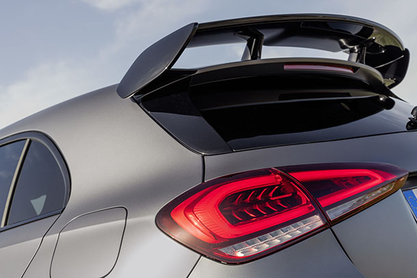 Le due vetture si differenziano anche per la grembialatura anteriore. Per la A 45 4MATIC+ è configurata nel design Jet-Wing. Alette orizzontali sulle griglie delle prese d’aria esterne e la griglia della presa d’aria inferiore allungata accentuano la larghezza del frontale. Lo splitter frontale confluisce senza soluzione di continuità negli air-curtain laterali davanti alle ruote anteriori che, ottimizzando il flusso dell’aria, migliorano anche l’aerodinamica e il valore Cx.