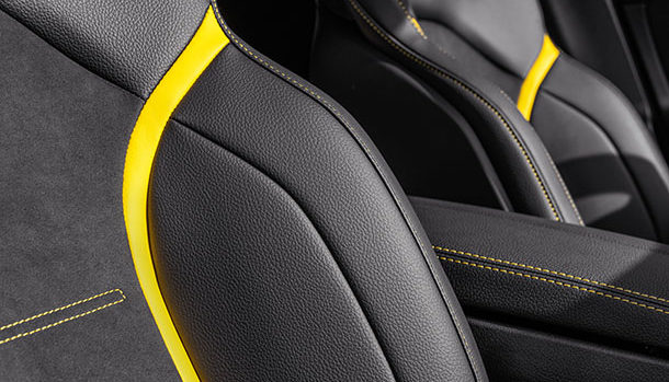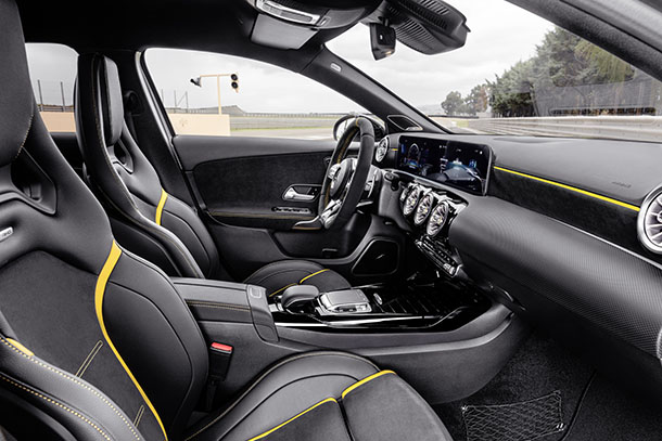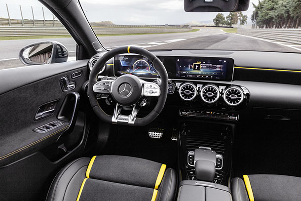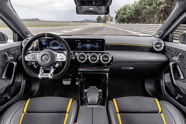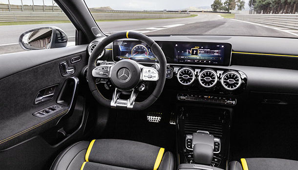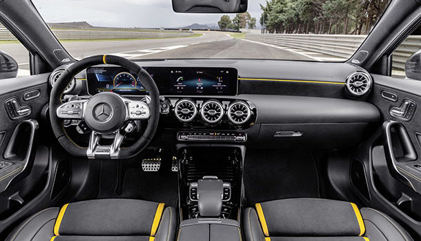 A 45 S e CLA 45 S si spingono ancora più in là: in tutto l’abitacolo si ritrovano elementi gialli che accentuano il carattere da competizione di questi potenti modelli. Inoltre, qui sono di serie il volante Performance AMG in pelle nappa/microfibra DINAMICA con cucitura di contrasto gialla, tacca di riferimento “a ore 12” gialla, tasti al volante AMG e logo AMG, così come l’illuminazione di atmosfera.