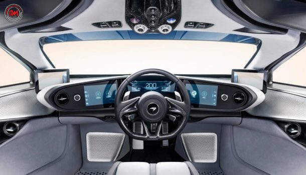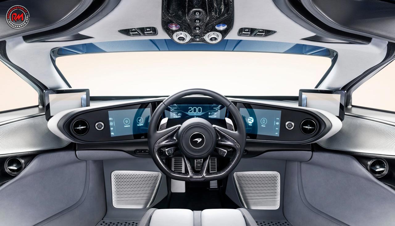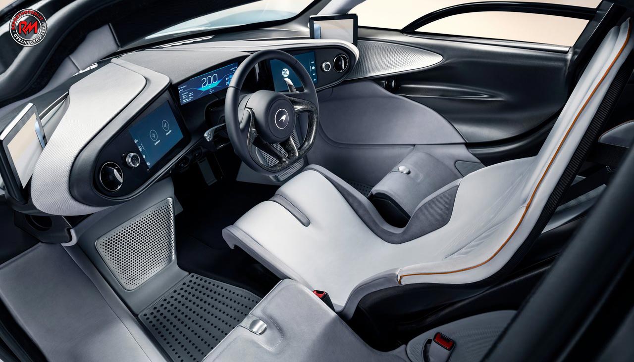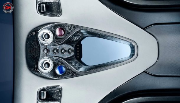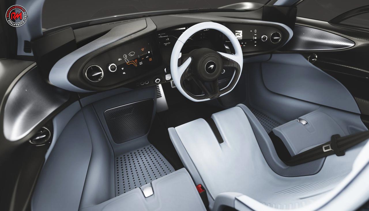Il guidatore siede al centro, lo spazio per lo stivaggio di bagagli è presente sia all’anteriore che posteriore, nell’abitacolo la fibra di carbonio e la pelle prendono il sopravvento.