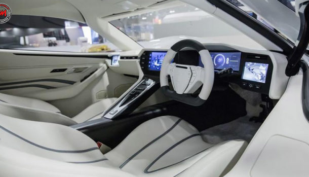 Il tetto degrada dolcemente verso il posteriore dell’auto culminando in un enorme alettone da corsa con le porte con l’apertura ad ala di gabbiano, soluzione che in auto con certe caratteristiche è ormai una necessità, come sono una necessità le appendici varie per assicurare aerodinamicità ad alte velocità.