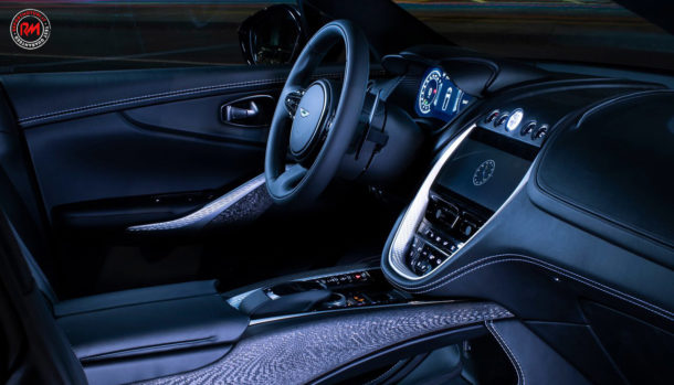 Aston Martin DBX by Q si distingue dalle versioni normali per il colore della carrozzeria in Xenon Grey e per i cerchi da 22” verniciati in nero oltre a tutta una serie di rifiniture in fibra di carbonio.