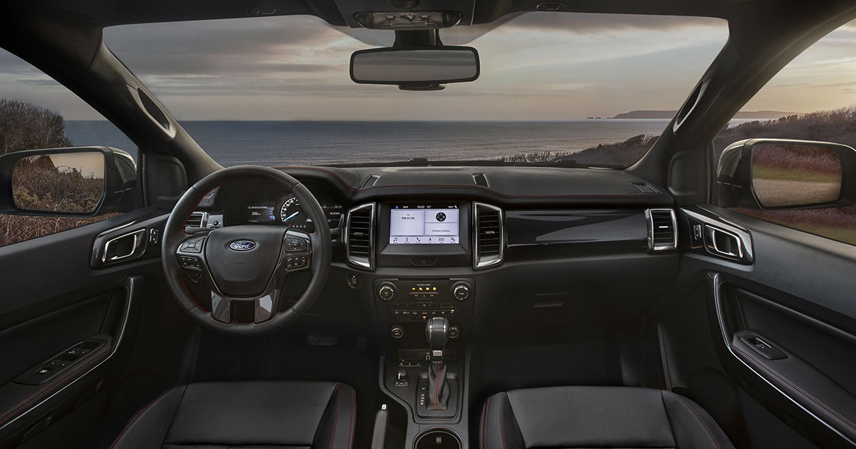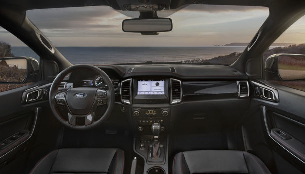 Gli interni si caratterizzano per il tradizionale comfort del Ranger con i sedili in pelle con dettagli a contrasto di colore rosso e cuciture coordinate per volante, cruscotto e gli elementi più importanti dell’abitacolo.