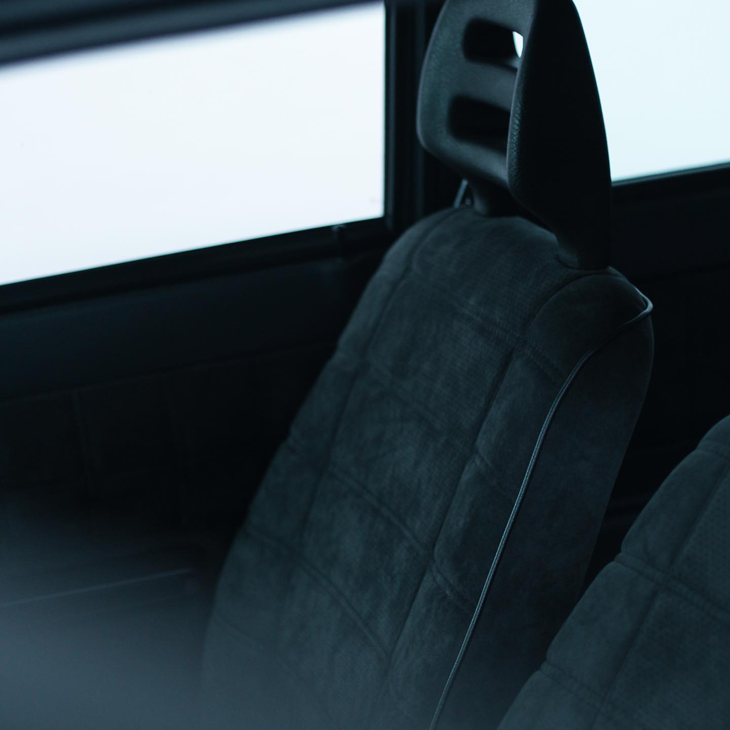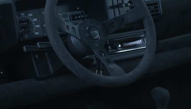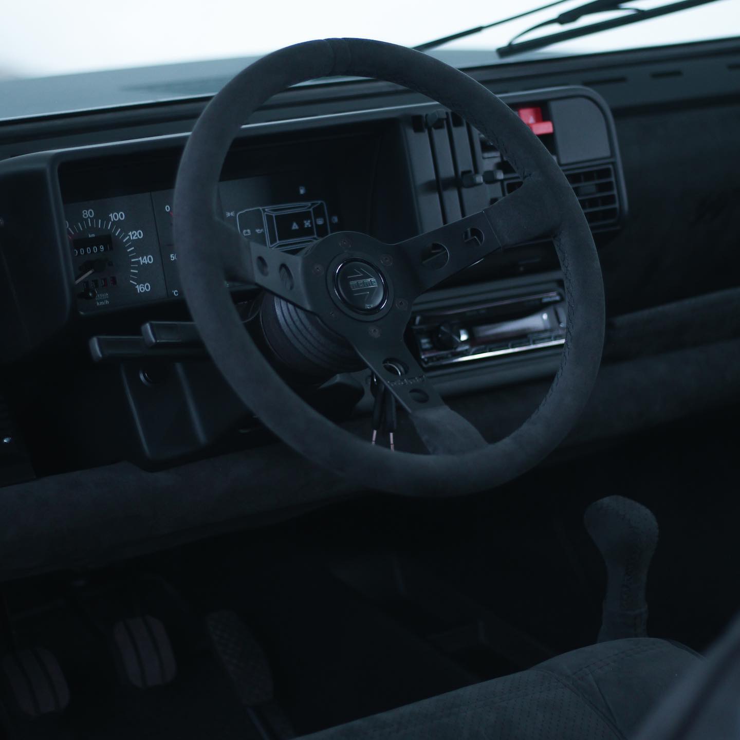 La struttura dell’abitacolo è originale, ed è un tripudio di Alcantara che riveste il volante sportivo a tre razze Momo, il cambio, i pannelli porta, e la parte bassa della plancia, dove è stato installato un impianto audio JBL.
