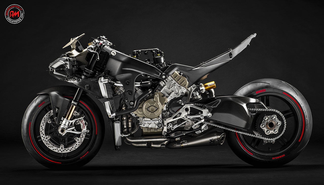 Pesa circa 2,8 kg in meno rispetto al V4 da 1,1 litri, sprigiona una potenza massima, in configurazione stradale, di ben 224 cavalli, valore che in presenza dello scarico Akrapovic realizzato in titanio ed incluso nel kit racing, raggiunge quota 234 cv!