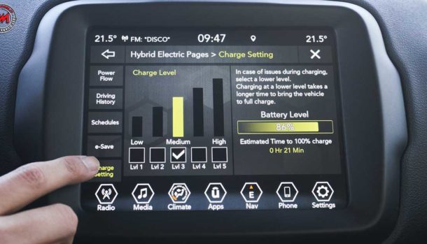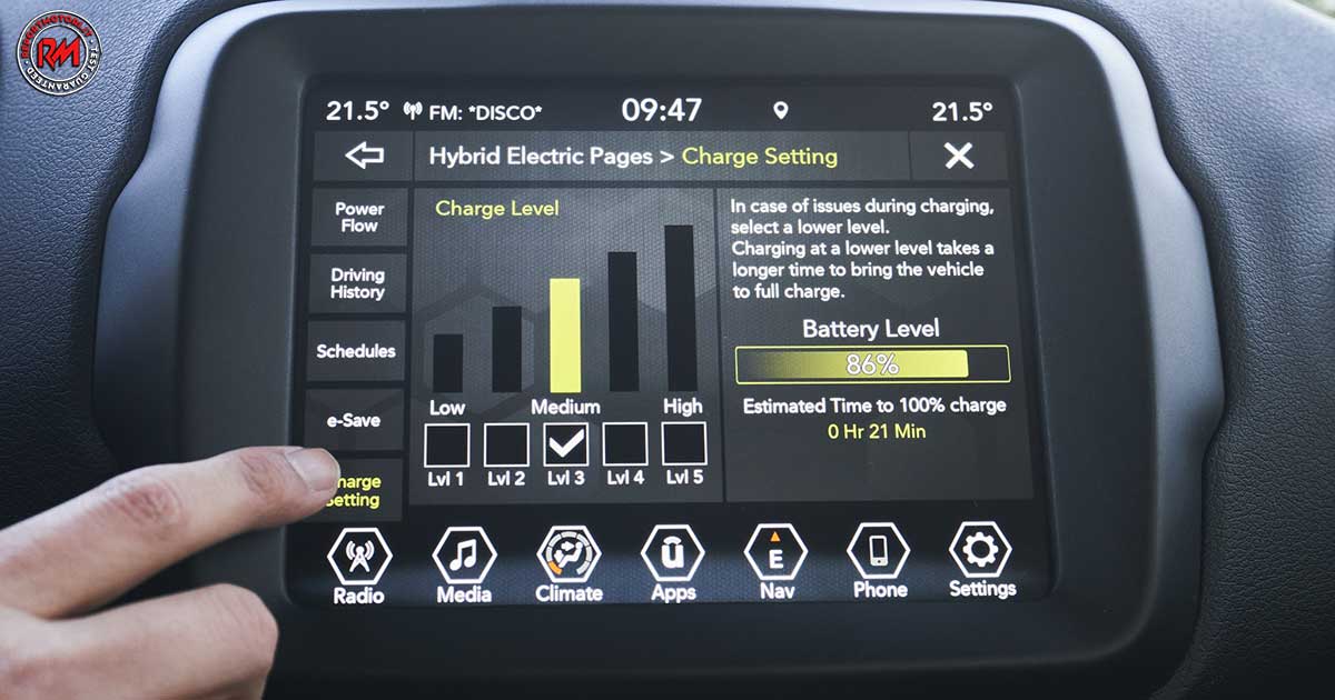 Renegade e Compass 4xe sono dotate del nuovo display a colori TFT da 7” che fornisce indicazioni sul livello di carica della batteria, sulll’autonomia in modalità elettrica, a combustione interna e combinata, la percentuale di potenza e i livelli di carica e dello schermo a colori del sistema Uconnect da 8,4 pollici per visualizzare il flusso di potenza, lo storico di guida, programmare i tempi di ricarica, la gestione della modalità eSave e le diverse impostazioni di guida.