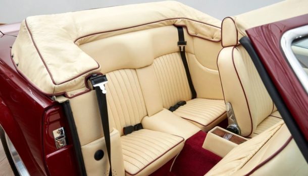 E’ uno splendido esemplare del 1988, ha interni in pelle color crema, una carrozzeria rosso intenso e finiture in radica di noce.