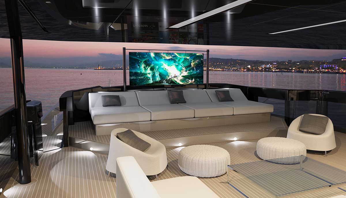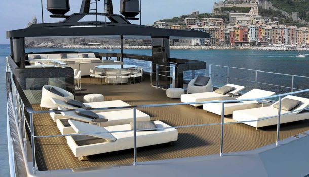 La particolare disposizione dei ponti, che prevede che la zona timoneria e tutto il ponte di prora siano a un’altezza intermedia tra Main Deck e Upper Deck, permette di mettere in comunicazione con un dislivello minimo tutta la parte superiore dell’imbarcazione, rendendola di fatto un’enorme terrazza di oltre 200 mq affacciata sul mare, un’ampia porzione della quale, di ben 90 metri quadrati, è protetta ed ombreggiata dall’ hard top”.