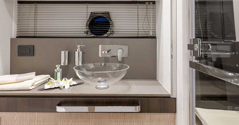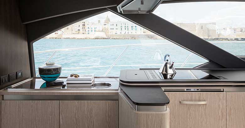 Anche la cucina riprende le tonalità scelte per il decoro dello yacht: ante in legno chiaro, con venature, gli elettrodomestici sono nascosti, il top e lavabo sono arricchiti da un piano ad induzione di colore marrone scuro.