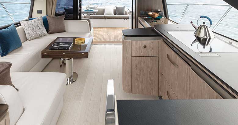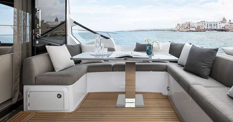 Il ponte principale presenta una zona giorno aperta sul deck esterno, una grande area lounge accogliente, spinta un divano su misura ed un tavolo da pranzo.
