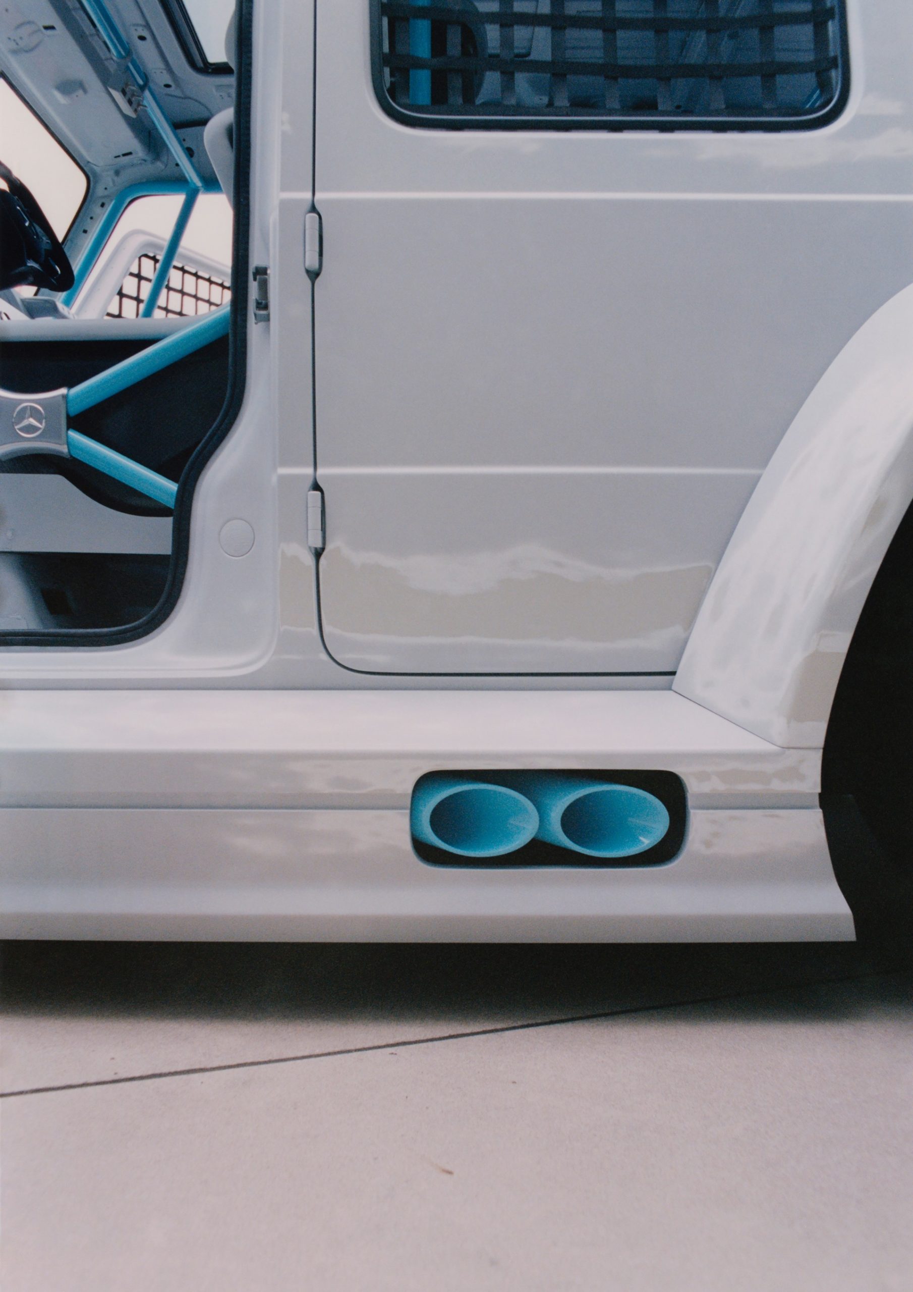 La carrozzeria squadrata della Classe G è stata impreziosita da un body kit che l’ha resa sensibilmente più muscolosa: parafanghi allargati e più alti, minigonne laterali e nuovi cerchi.