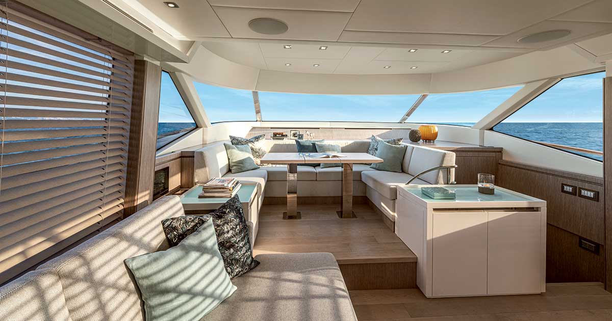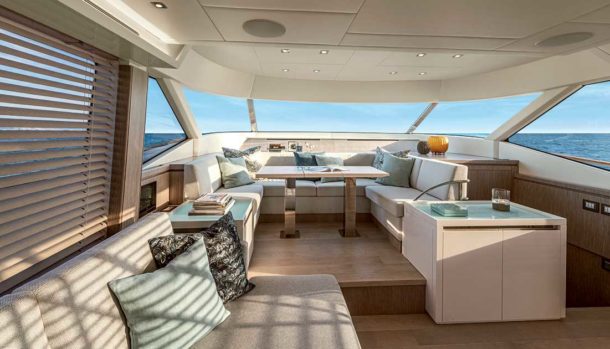 Altra novità è la presenza di un Fybridge chiuso che enfatizza il livello di benessere a bordo, in ogni stagione.