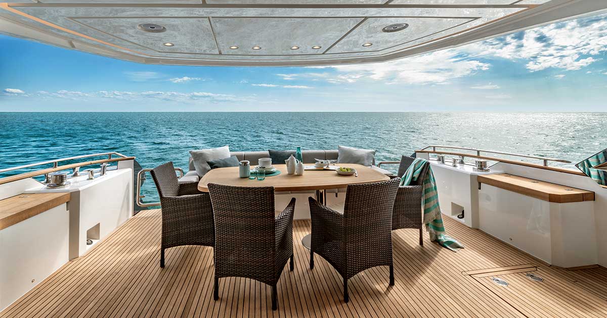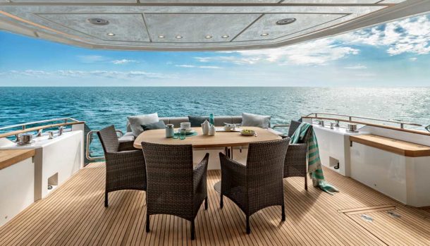 Sul ponte superiore è presente un ampio terrazzo a poppa, questo il vero valore aggiunto dell’imbarcazione, una zona questa, completamente personalizzabile su richiesta ed esigenza dell’armatore.