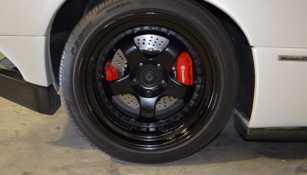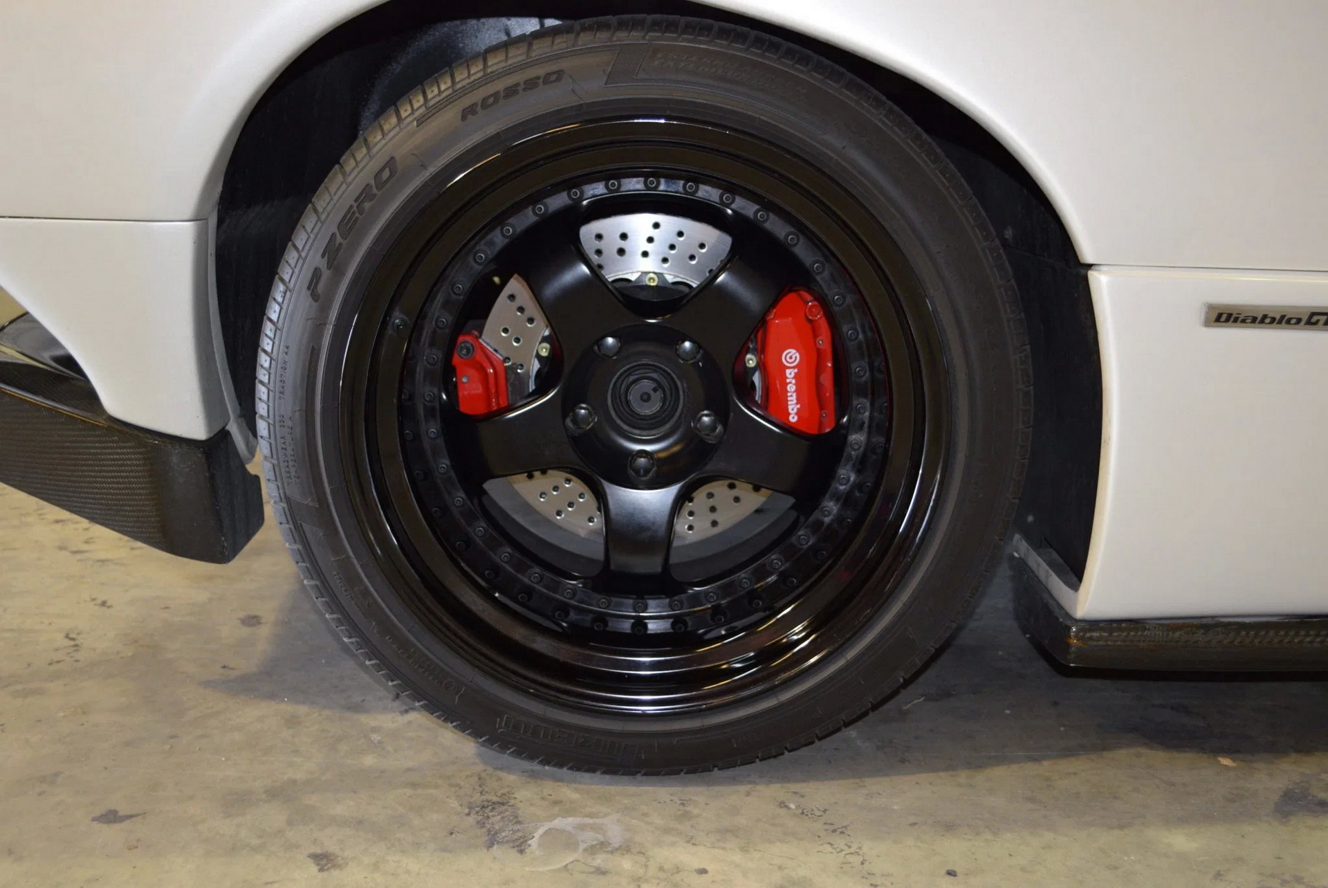 Questo Diablo è dotata di un setdi ruote da 18 pollici con pneumatici Pirelli P Zero e pinze rosse. Inoltre, l’attuale venditore ha installato un nuovo sistema frenante posteriore con un kit Brembo.