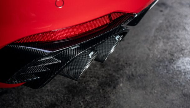 E’ stato rivisto anche l’impianto di scarico, che ora prevede quattro terminali tondi, in fibra di carbonio, ognuno con un diametro di 102 mm.