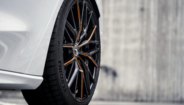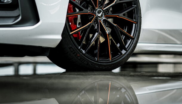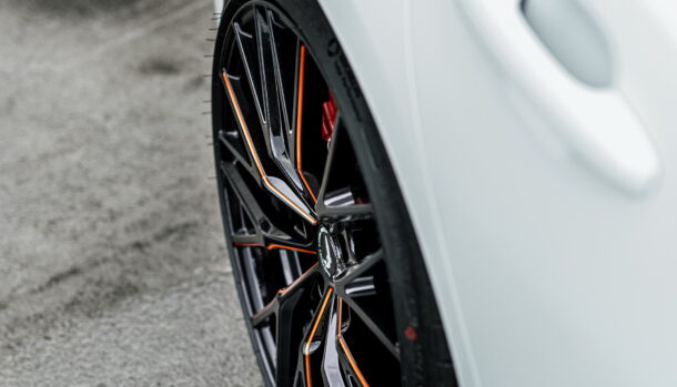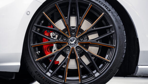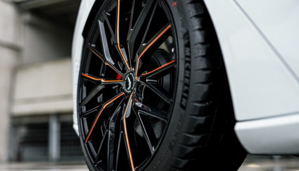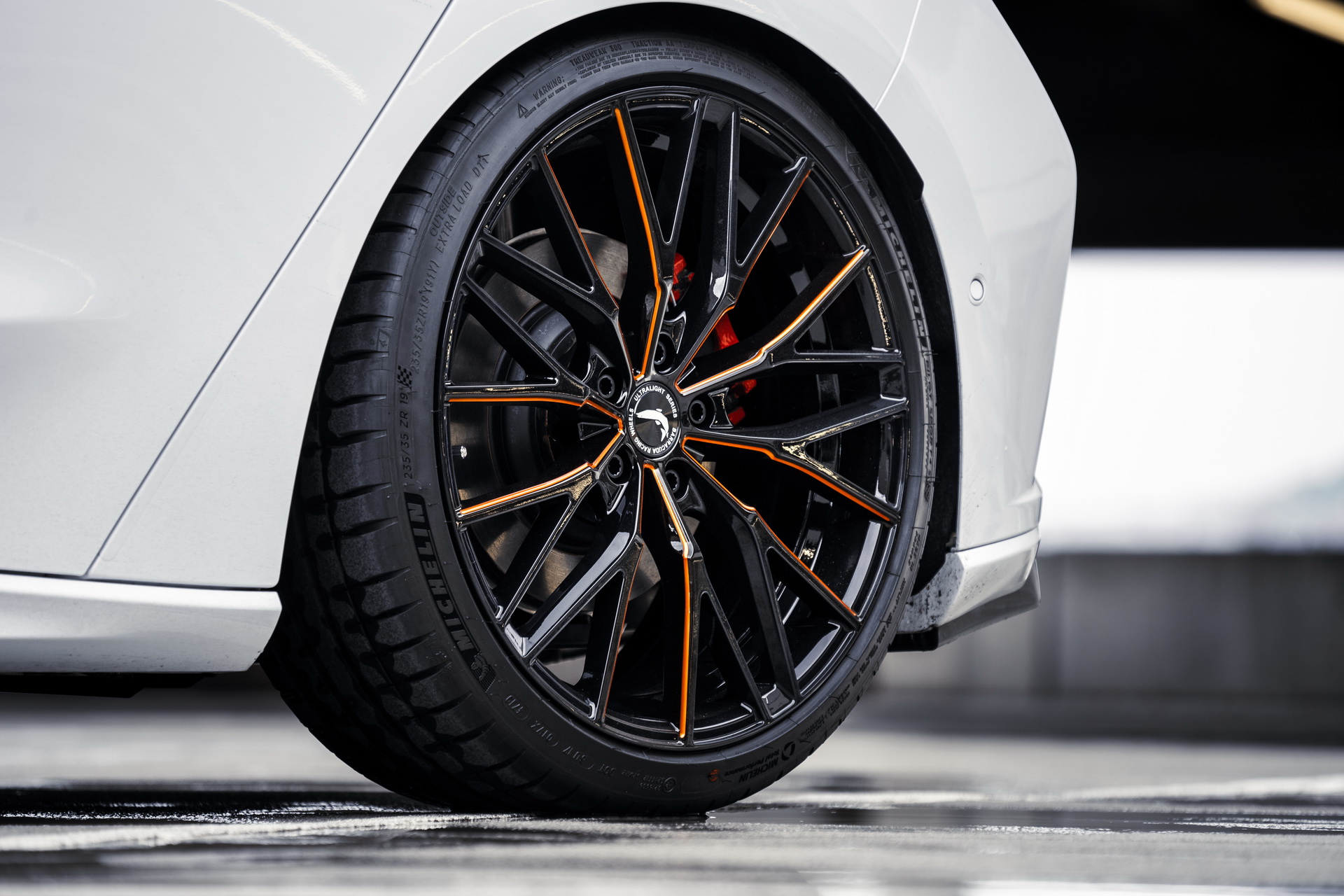 I cerchi con look nero e richiami arancione sono della serie Ultralight di Barracuda , denominati Project 3.0, hanno dimensione 8,5 x 19 pollici , presentano un motivo a raggi a Y e calzano pneumatici Michelin 235/35.