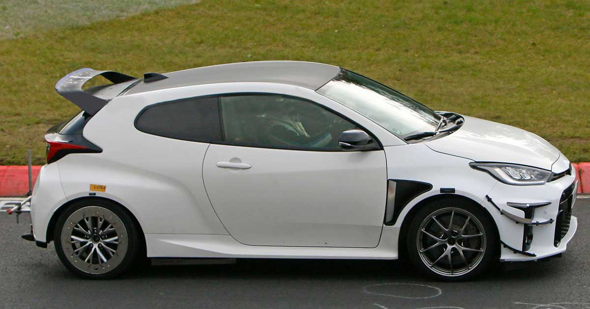 Lungo il circuito del Nurburgring è stata sorpresa una Yaris tre porte cattivissima, impreziosita di un enorme alettone posteriore e affilati profili alari anteriori.