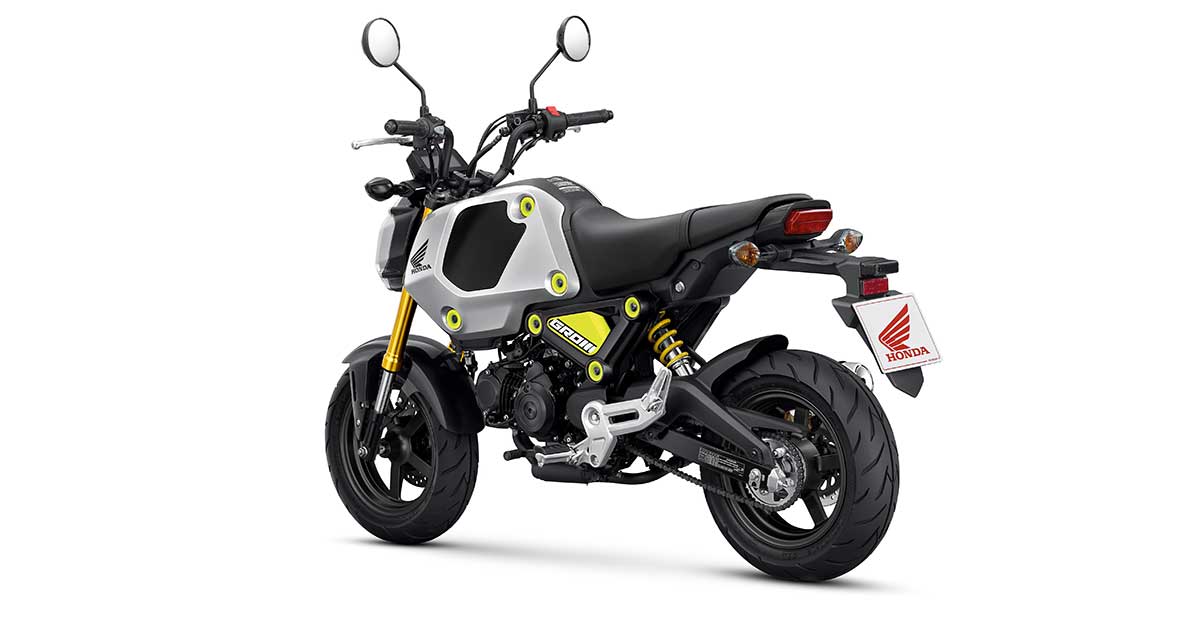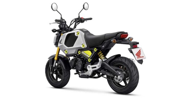 La nuova Honda MSX 125 Grom utilizza un telaio monotrave dorsale in acciaio scatolato, una forcella a steli rovesciati da 31 millimetri, un ammortizzatore posteriore centrale e cerchi in alluminio da 12 pollici con design a 5 razze.