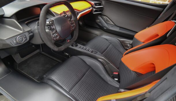 All’interno è presente il pacchetto Launch Control con sedili rivestiti in morbida pelle nera con inserti in Alcantara: immancabili i richiami alle strisce arancio racing presenti sulla carrozzeria.