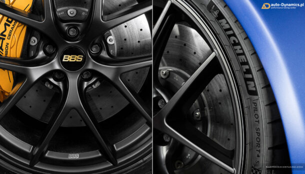 Sono state installate molle sportive ribassate della Eibach, nuove tubazioni in treccia della Fischer Stahlflex per l’impianto frenate e cerchi BBS da 20 pollici su pneumatici Michelin Pilot Sport Cup 2.