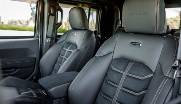L’influenza della Jeep Gladiaotr è evidente, la pelle sovrasta ogni particolare, a richiesta è disponibile anche il rivestimento per il cielo in pelle scamosciata.