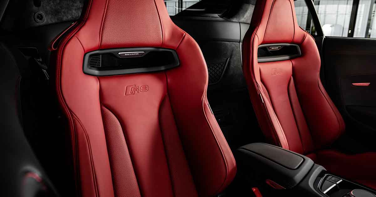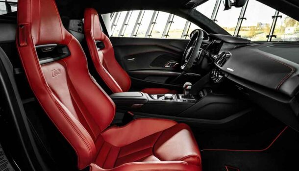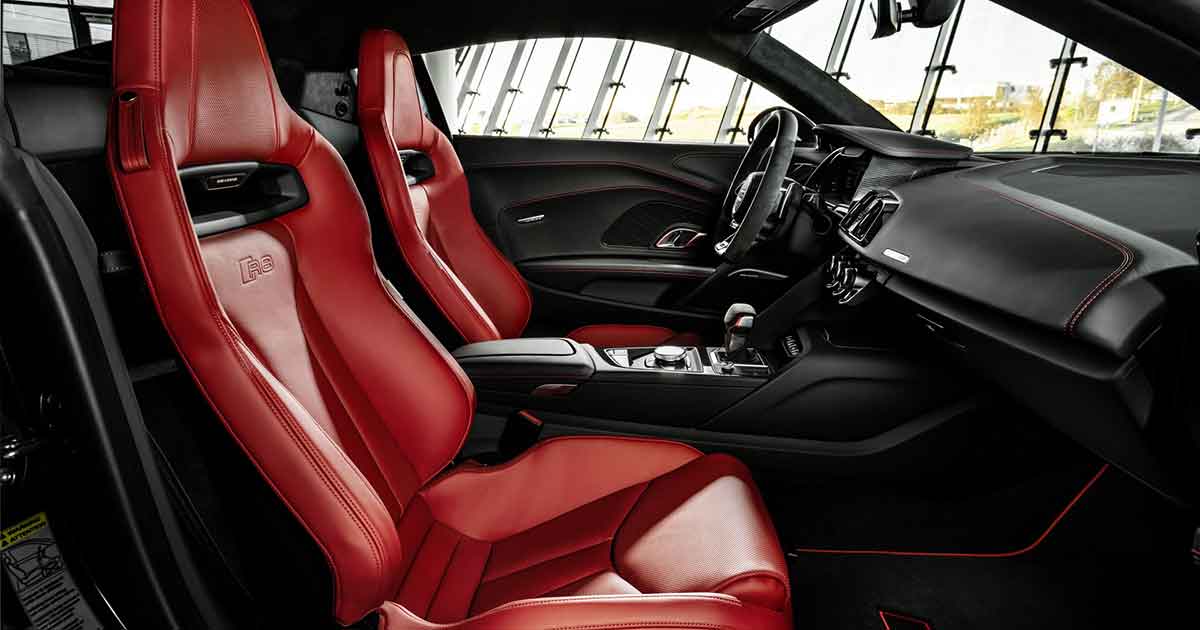 I tappetini sono speciali e riportano il logo R8, le cuciture sono a contrasto rosso.