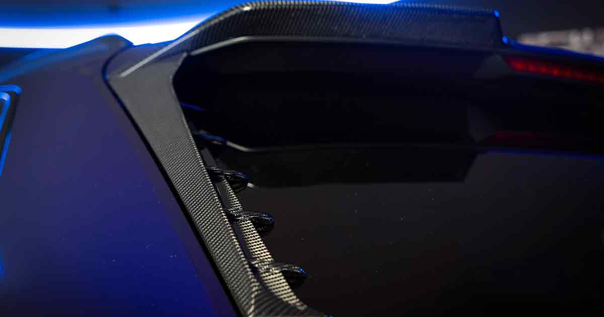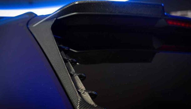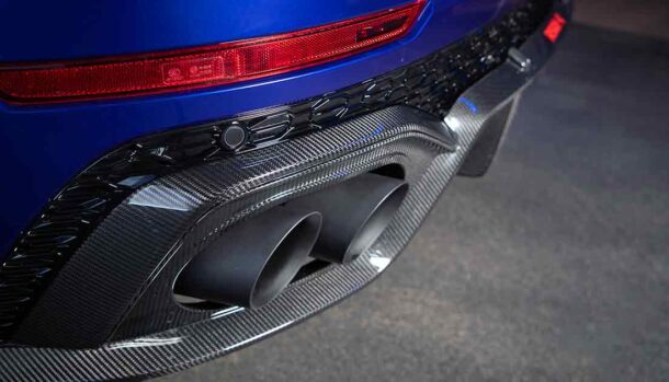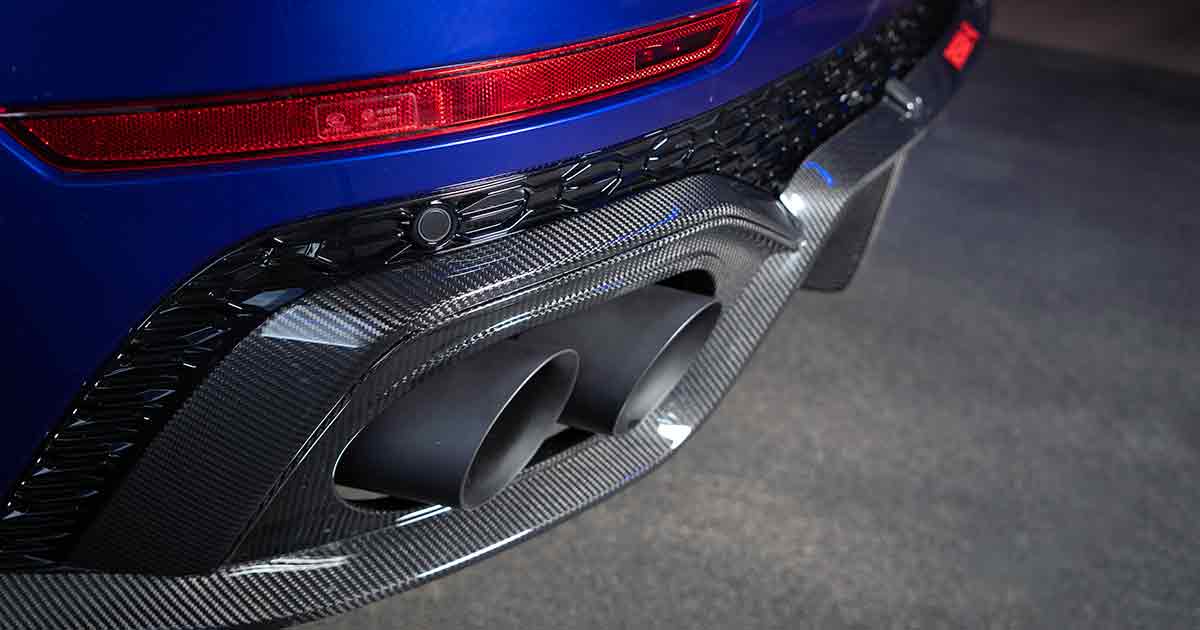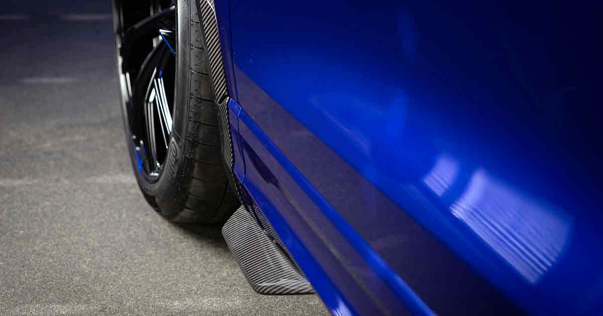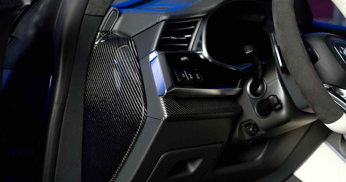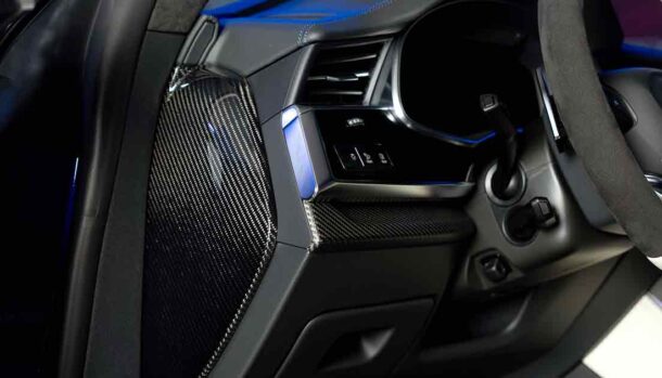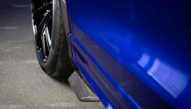 Il pacchetto aerodinamico prevede numerosi accessori in fibra di carbonio, dalle minigonne laterali alle calotte specchi retrovisori, dallo splitter anteriore ai parafanghi allargati, fino allo spoiler posteriore.