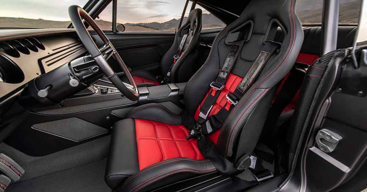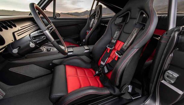 All’interno l’abitacolo mostra un aspetto retrò, con sedili Recaro GT Sportster rivestiti in pelle rossa e nera e finiture in fibra di carbonio, alluminio spazzolato e…