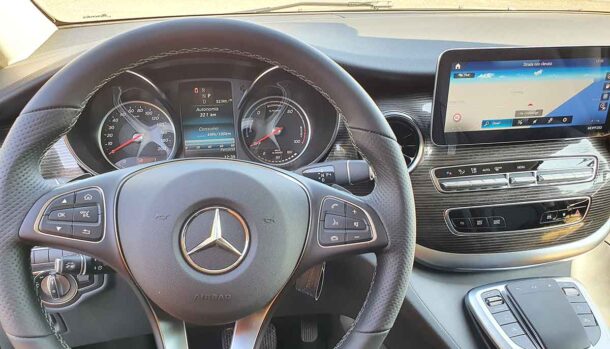 Il conducente accede da una porta classica e si trova su una postazione di guida non solo comoda e spaziosa ma anche tecnologica. Il tablet da 10.25 pollici con a bordo il sistema MBUX ne è l’esempio classico, ma più in generale con i piedi si comanda un forte concentrato tecnologico.