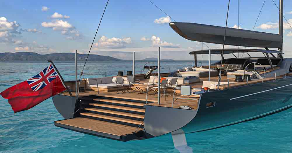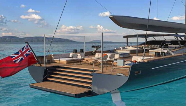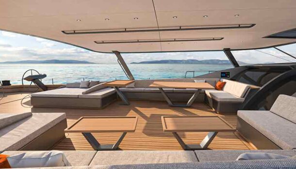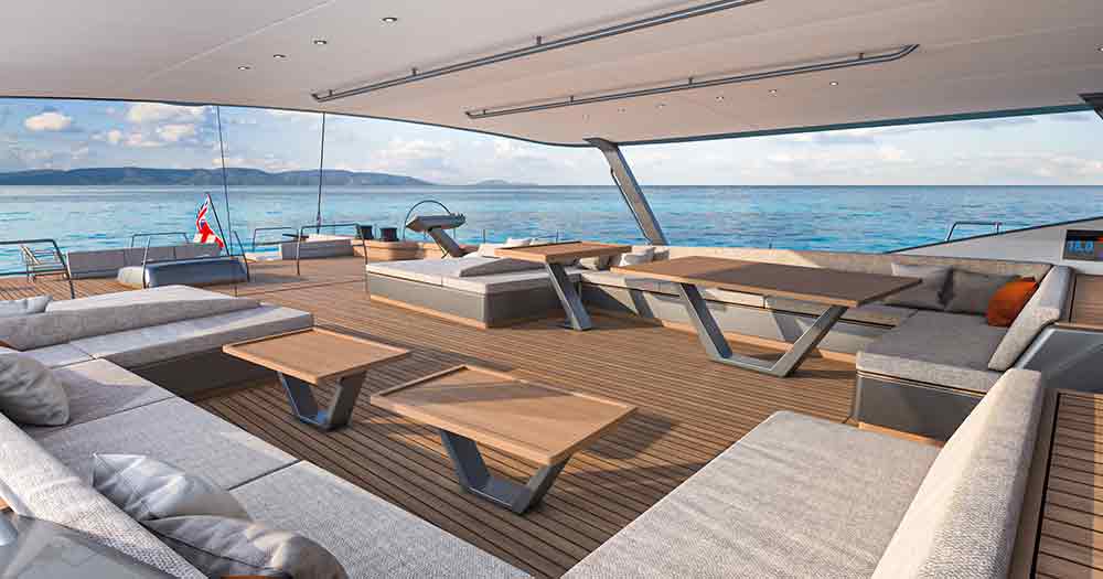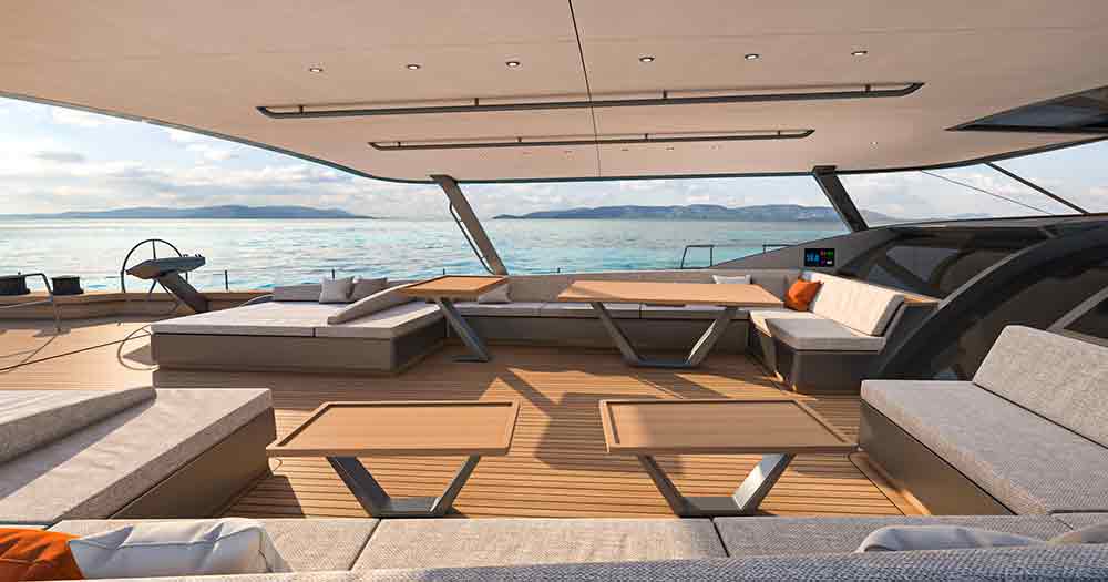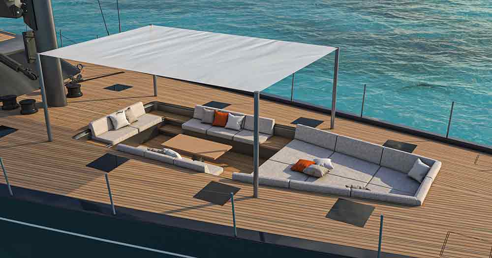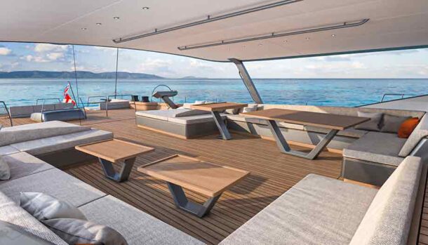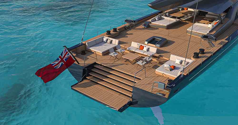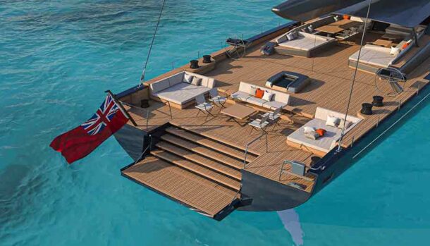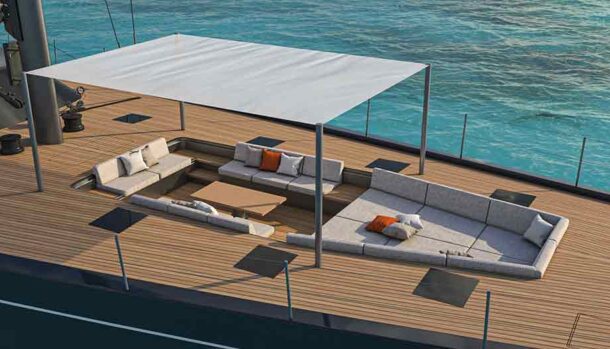 L’ampio specchio di poppa, di quasi 10 metri, prevede una sezione incernierata del ponte in teak che si ripiega idraulicamente in un unico movimento per trasformarsi nella piattaforma della spiaggetta, il pozzetto degli ospiti, protetto da un hardtop in composito di carbonio per poi essere rimosso in modalità regata ed una zona a prua dell’albero.