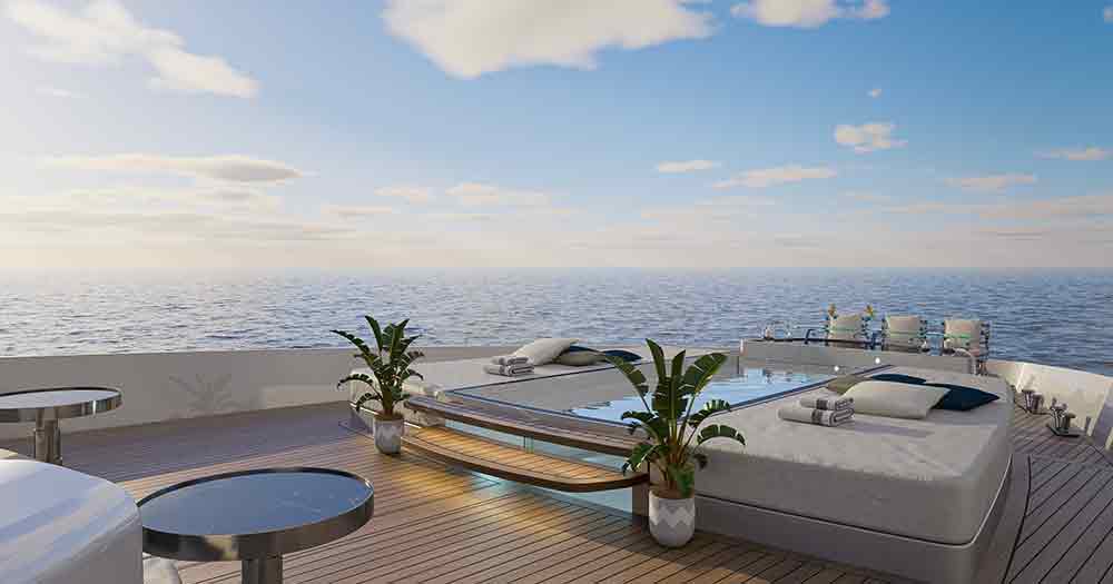 La silhouette dello scafo ricorda i panfili a vela di altri tempi, con la grande piscina panoramica posta a soli 50 cm dall’acqua.