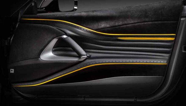 Per contrasto è stato scelto il colore giallo, sulle cuciture ed i profili dei sedili con un badge sulla parte posteriore, sui pannelli delle portiere, sulla console centrale, sul volante, sul cruscotto e persino nel cielo dell’abitacolo.
