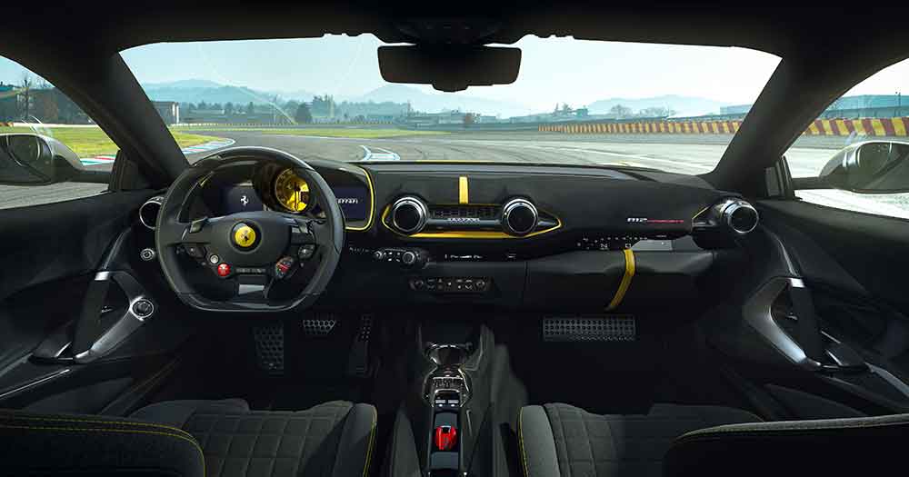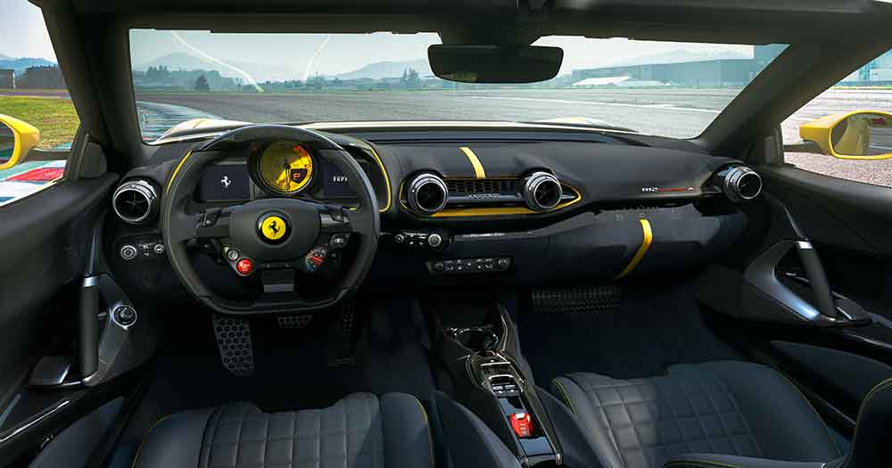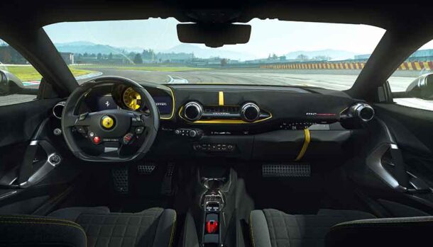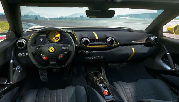 Rispetto agli 800 cavalli della 812 Superfast, la potenza sale di 30 cavalli, a tal fine è stato ottimizzato l’impianto di raffreddamento, per la prima volta è presente un convogliatore di aspirazione a camera unica, che massima la quantità di aria inviata ai radiatori.