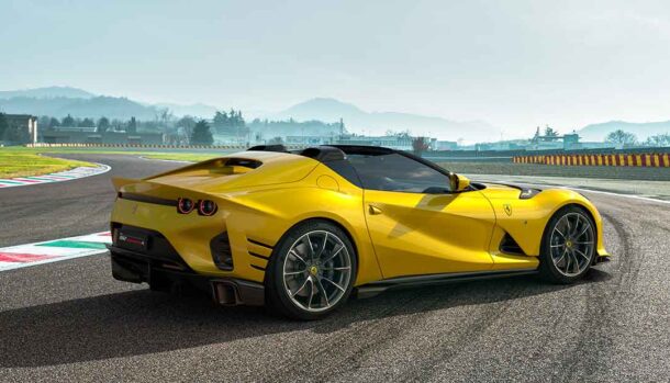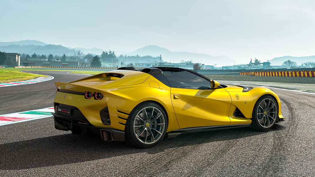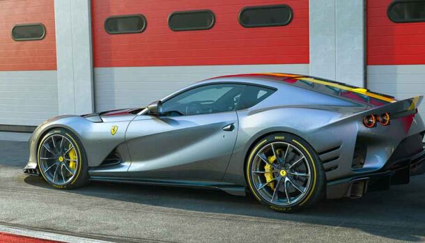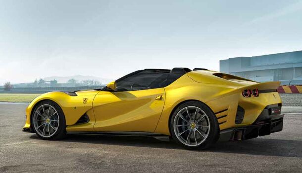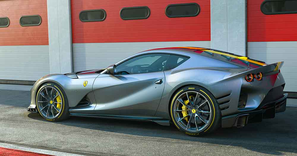 Al retro, troviamo uno spoiler più alto rispetto a quello presente sulla Superfast, così nuova è anche la conformazione dei passaruota, alleggeriti e dalla differente conformazione. Altra novità è costituita dal lunotto, completamente chiuso, ciò ha permesso di realizzare una serie di soluzioni inedite ovvero di dotarlo di tre coppie di elementi profilati, che agiscono come generatori di vortici. Un plus tecnico che si traduce in un aumento del 10% del carico aerodinamico posteriore rispetto alla 812 Superfast.