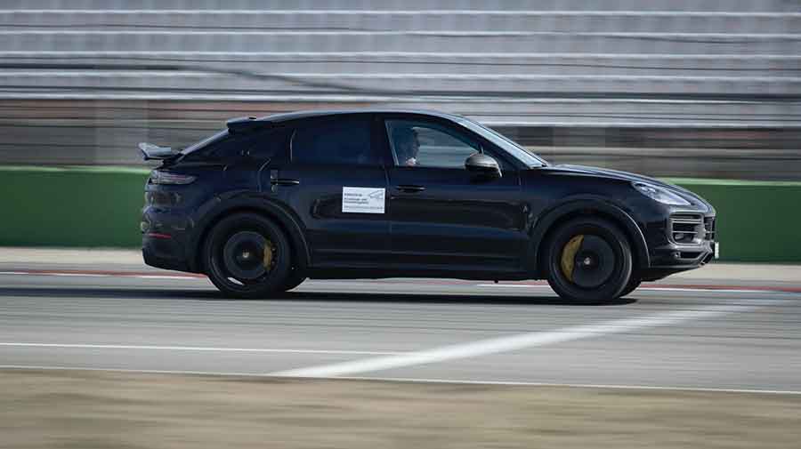“Rispetto alla Cayenne Turbo Coupé, i cerchi anteriori sono stati allargati di mezzo pollice e la campanatura negativa è stata aumentata di 0,45 gradi per fornire una maggiore area di contatto agli pneumatici sportivi da 22 pollici sviluppati appositamente per questo modello”.