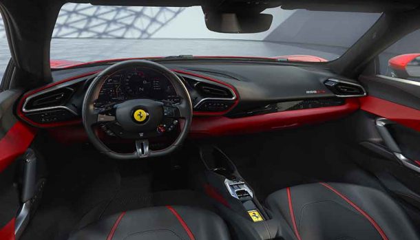 Gli interni sono altamente innovativi, la strumentazione è full-digital, il tunnel centrale ha la stessa impostazione della SF90 Stradale, i sedili hanno un design specifico. Per la prima volta è presente anche l’Head-Up Display per la massima sicurezza.