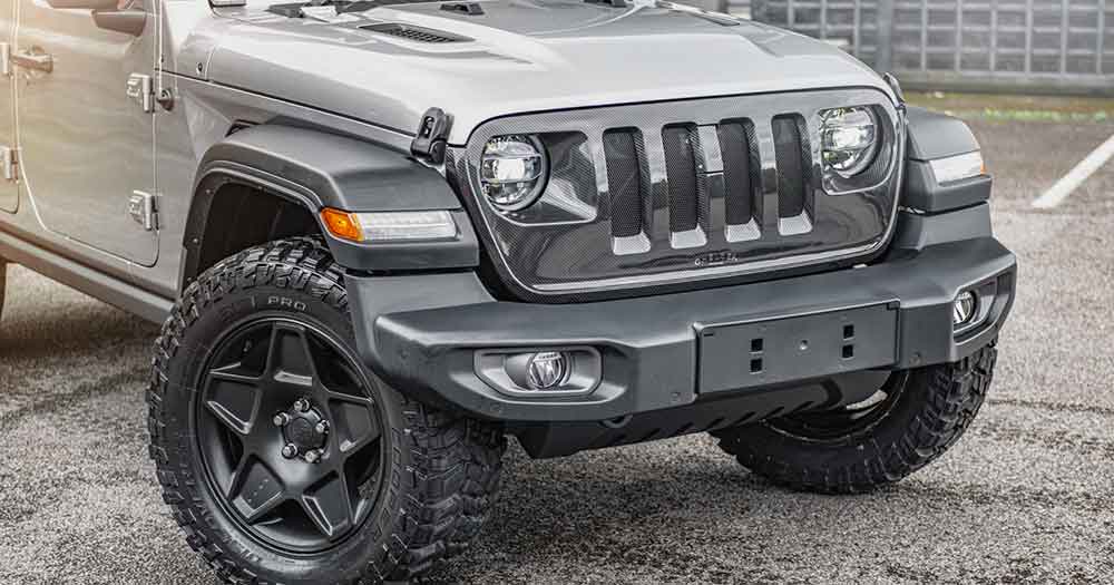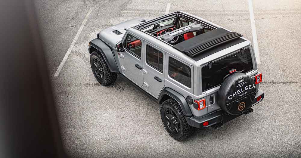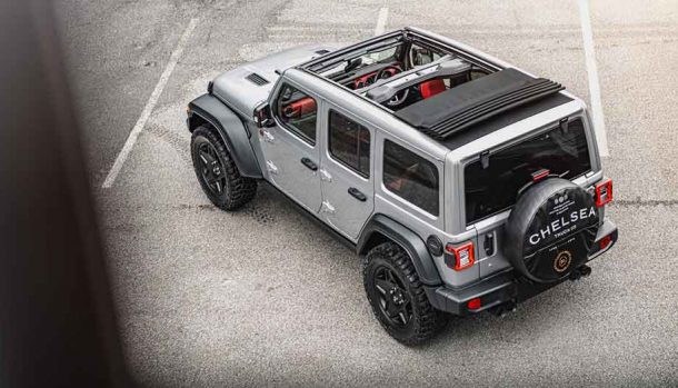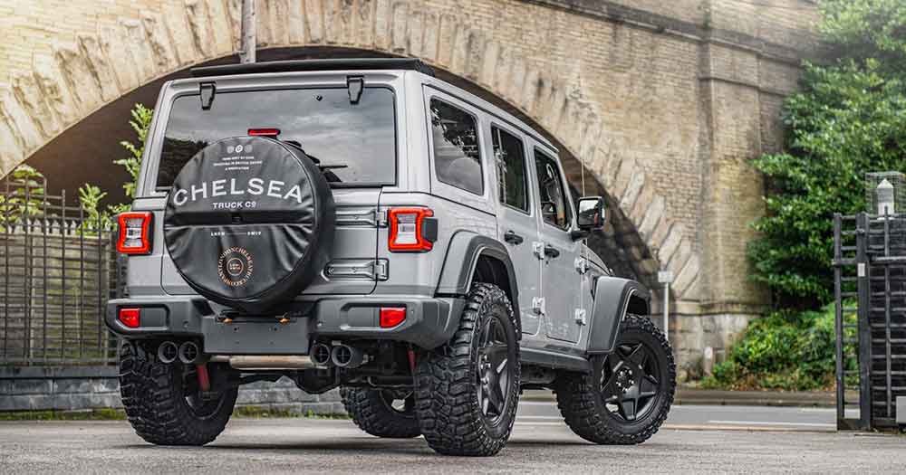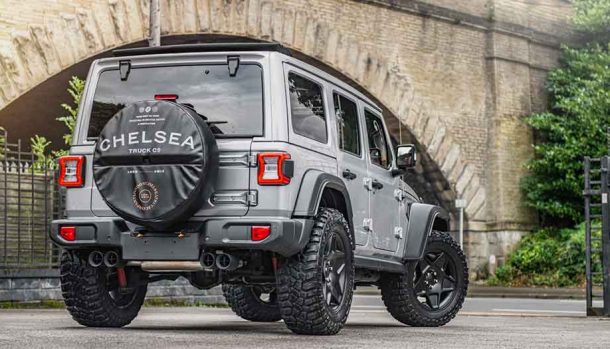 La Jeep è con guida a destra e si presenta con una livrea in Granite Crystal Grey Metallic, cerchi in lega neri da 20 pollici che calzano pneumatici All-Terrain, griglia in fibra di carbonio, quattro terminali di scarico e tappo del serbatoio del carburante e copriruota della ruota di scorta con badge Chelsea Truck Company, azienda inglese specializzata nella commercializzazione di fuoristrada e che ne cura la vendita.