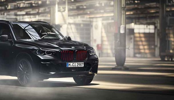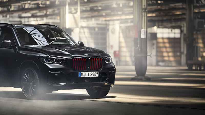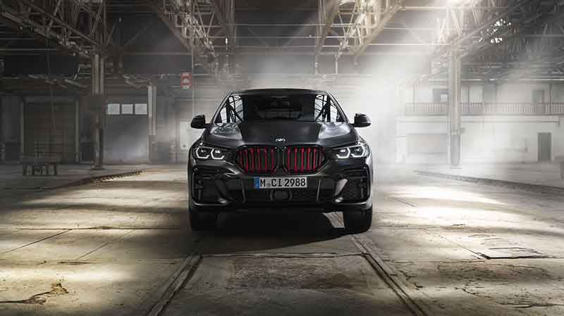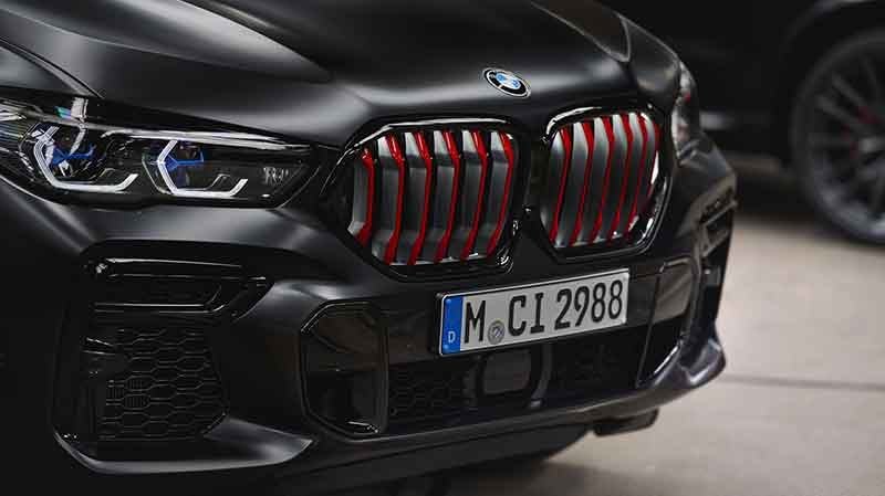 Le versioni Black Vermilion dei SUV X5 e X6 si presentano con un abbinamento cromatico rosso e nero che risalta particolarmente nel doppio rene frontale che presenta delle barre verticali rosse, in contrasto con la colorazone della carrozzeria Frozen Black metallic.