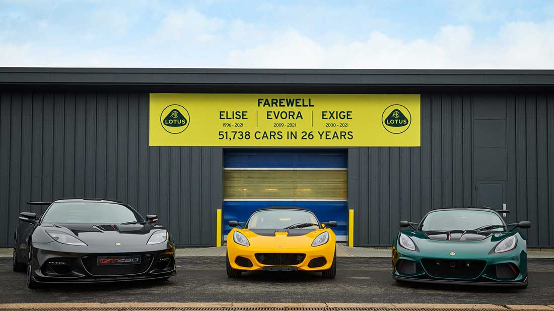 Questi tre esemplari della Casa automobilistica inglese Lotus Cars sono arrivati al capolinea della loro vita e dopo un periodo di oltre 26 anni, iniziato nel 1996 con Elise ed Exige e proseguito nel 2000 con Evora, escono di produzione.