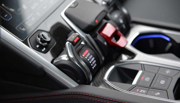 Sul tunnel centrale è posizionato il selettore di guida, il cambio ed il tasto di accensione a cui si accede sollevando la speciale levetta rossa, in perfetto stile aeronautico.