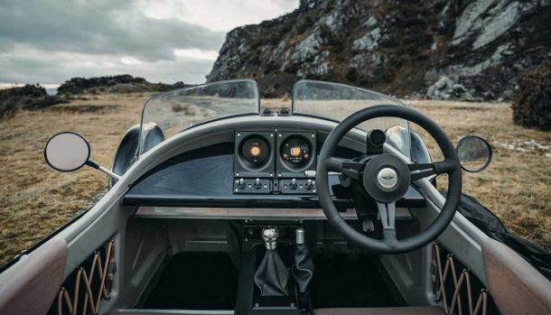 Nel cofano, il motore è visibile attraverso una rete, in ogni suo componente. Le sospensioni a tirante portano vantaggi dinamici e tutto l’insieme dinamico e meccanico richiama i veicoli Morgan a tre ruote dell’inizio del secolo.