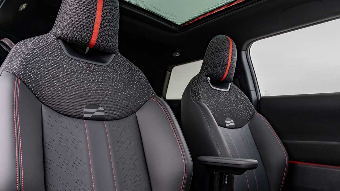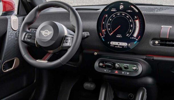 Anche nell’abitacolo è evidente la cura JCW, dal volante sportivo con comandi multifunzione ai sedili in pelle sintetica con cuciture rosse e multiprofilati, specifici per questa versione sono anche i rivestimenti dei pannelli portiera e plancia.