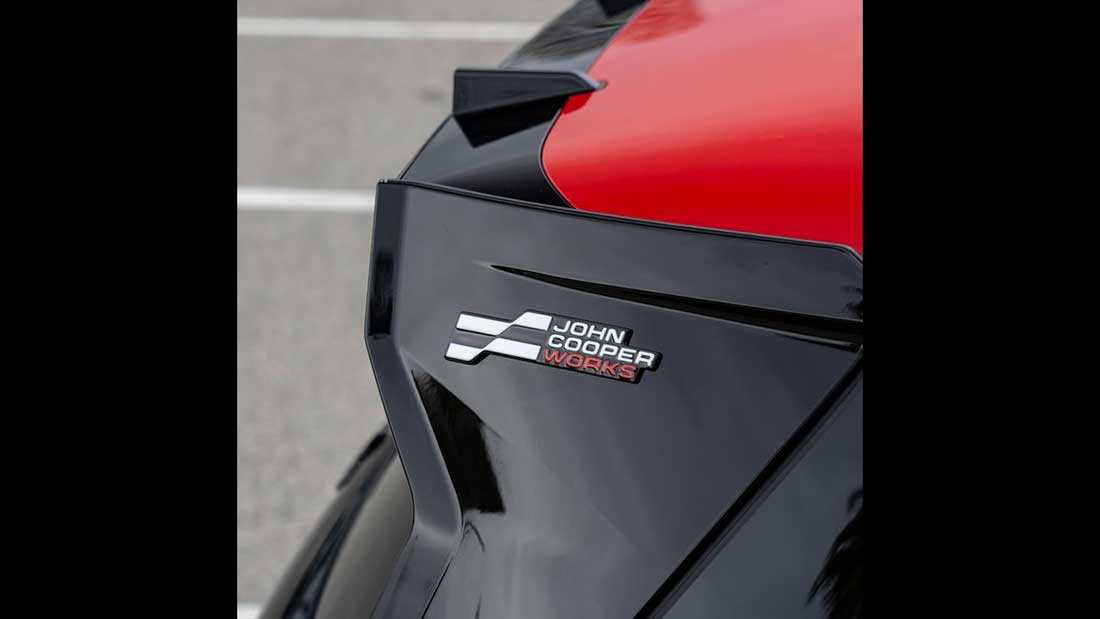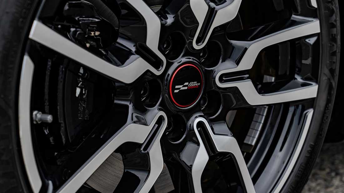 All’interiore spicca un paraurti totalmente rivisto che si caratterizza per un accentuato splitter inferiore, evidenti anche le minigonne laterali e il massiccio spoiler posteriore con tanto di pinne laterali. Evidente la cura aerodinamica che il kit JCW comporta, l’estrattore aria inferiore ha un aspetto racing.